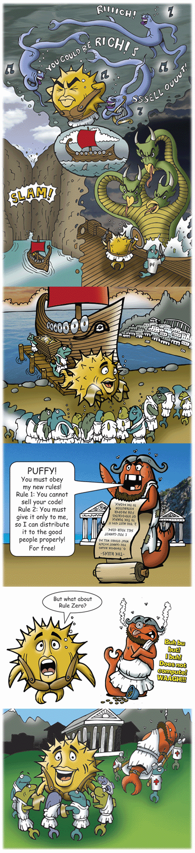 Every 6 months the OpenBSD project has the pleasure to release our software with artwork and a matching song. Theo and some other developers mutate a theme (from a classical setting, a movie, or some genre) into the fishy world of Puffy, to describe some advance, event or controversy the project went through over the previous six months. To match the art released with the historical CD sets, we joined up with some musicians we know to make at least one song.